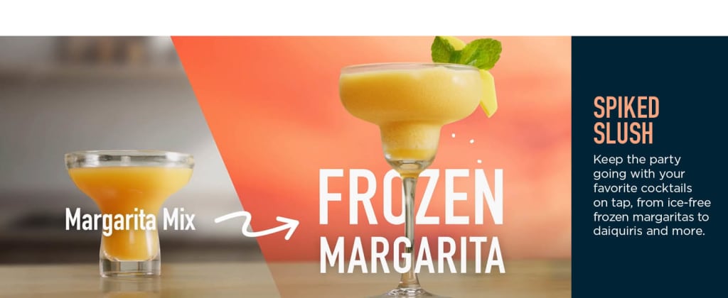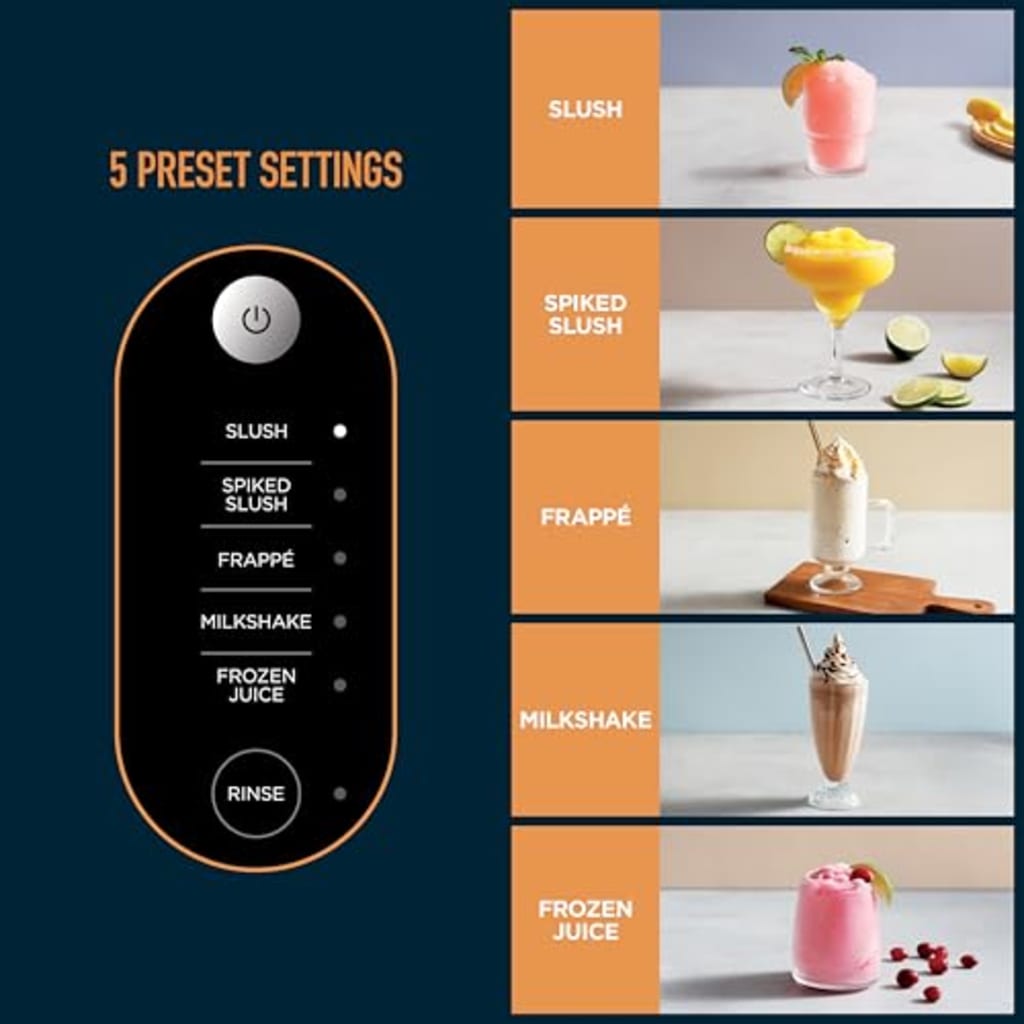 Enjoy five preset programs—slush, spiked slush, frappé, milkshake, juice—and adjust thickness for custom textures. RapidChill technology ensures even freezing without ice, while the 88-ounce vessel serves nine 9-ounce portions per batch.